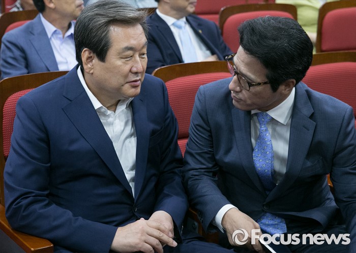 (서울=포커스뉴스) 13일 오전 서울 여의도 국회 의원회관에서 열린 대한민국 미래혁신포럼 창립기념 특강에 참석한 김무성(왼쪽) 새누리당 전 대표와 정병국 의원이 대화하고 있다.