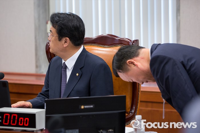(서울=포커스뉴스) 김재원(오른쪽) 대통령비서실 정무수석이 13일 오전 서울 여의도 국회에서 열린 '운영위원회 전체회의'에 참석해 국회 운영위원회 위원장인 정진석 새누리당 원내대표에게 인사하고 있다.