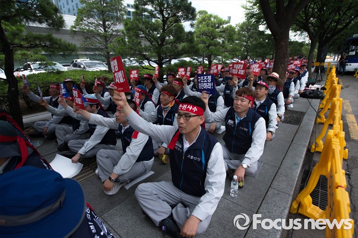 (서울=포커스뉴스) 13일 오전 서울 여의도 산업은행 본점 앞에서 삼성중공업 노동자협의회 관계자들이 고용안정 요구 및 정부의 조선업 구조조정을 규탄하는 상경 집회를 하고 있다.