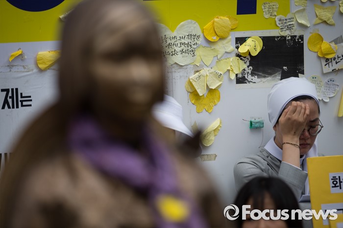 (서울=포커스뉴스) 자위대 창설 62주년 기념행사가 서울 한복판에서 열리고 하루가 지난 13일 오후, 서울 종로구 주한일본대사관 앞에서 일본군 '위안부' 문제 해결을 위한 제1239차 정기 수요집회가 열리고 있다.