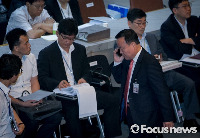 (서울=포커스뉴스) 13일 오전 서울 여의도 국회에서 열린 예산결산특별위원회 전체회의에 참석한 김재원 청와대 정무수석이 누군가와 통화를 하며 이동하고 있다.