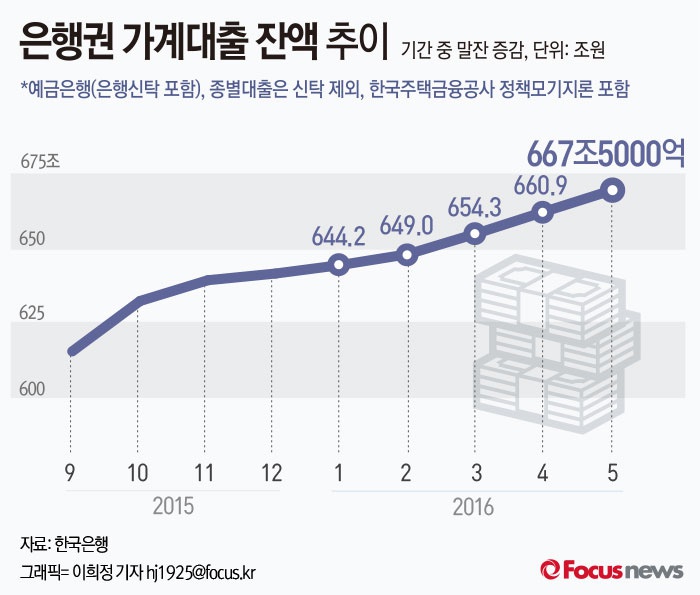(서울=포커스뉴스) 13일 한국은행이 공개한 '2016년 6월 중 금융시장 동향'을 보면 올 6월 은행 가계대출은 667조5000억원으로 전월 대비 6조6000억원 늘었다.