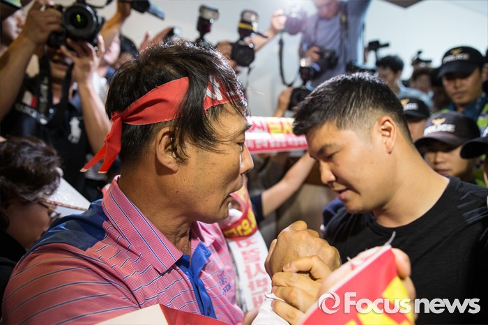 (서울=포커스뉴스) 국방부가 사드 배치 지역을 경북 성주로 확정 지은 13일 오후 서울 용산구 국방컨벤션에서 성주군민들이 군수와 국방부 관계자 면담자리에 진입을 시도하고 있다.