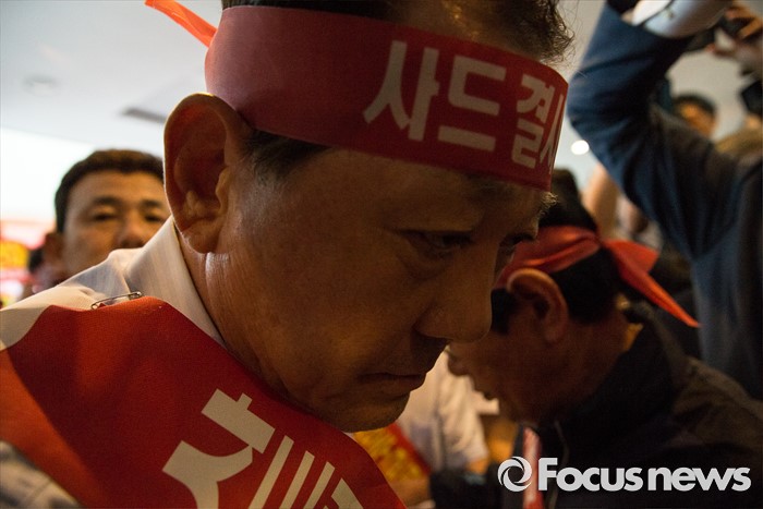 (서울=포커스뉴스) 13일 오후 서울 용산구 국방부를 찾은 김항곤(가운데) 성주군수와 군민들이 사드배치 반대 성명서를 전달하기 위해 국방컨벤션을 들어서고 있다. 이날 국방부에서 주한미군 고고도 미사일 방어 체계 사드(THAAD) 배치 지역을 성주로 결정하고 공식 발표했다.