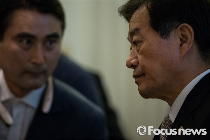 (서울=포커스뉴스) 국방부가 사드 배치 지역을 경북 성주로 확정지은 13일 오후 서울 용산구 국방컨벤션에서 황인무(오른쪽) 국방부 차관이 상경한 성주군민들의 거센 항의에 생각에 잠겨있다.