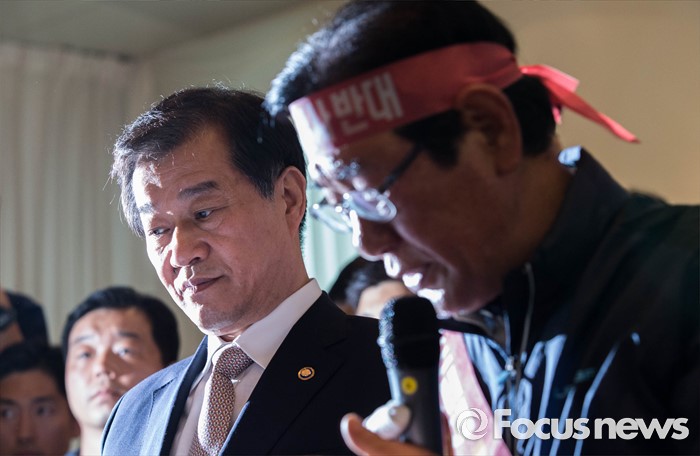 (서울=포커스뉴스) 13일 오후 황인무 국방부 차관이 경북 성주에 사드 배치를 확정한 국방부의 공식 발표 후 서울로 상경, 서울 용산 국방부 컨벤션센터를 항의 방문중인 김항곤 성주군 군수, 사회단체장 및 군민을 찾아 대화를 나누고 있다.