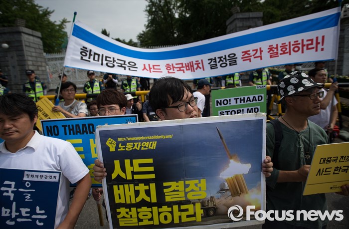 (서울=포커스뉴스) 13일 오후 평통사(평화와 통일을 여는 사람들) 관계자 및 시민들이 서울 용산구 국방부 앞에서 성주 사드 배치 반대 시위를 하고 있다. 이날 국방부는 주한미군 고고도 미사일 방어 체계 사드(THAAD) 배치 지역을 성주로 결정, 발표 했다.