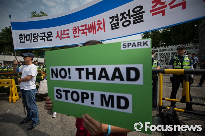 (서울=포커스뉴스) 13일 오후 평통사(평화와 통일을 여는 사람들) 관계자 및 시민들이 서울 용산구 국방부 앞에서 성주 사드 배치 반대 시위를 하고 있다. 이날 국방부는 주한미군 고고도 미사일 방어 체계 사드(THAAD) 배치 지역을 성주로 결정, 발표 했다.