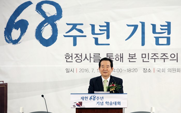 (서울=포커스뉴스) 정세균 국회의장이 13일 오후 서울 여의도 국회 의원회관에서 열린 '제헌 68주년 기념 학술대회'에 참석해 축사를 하고 있다. <사진제공=국회>