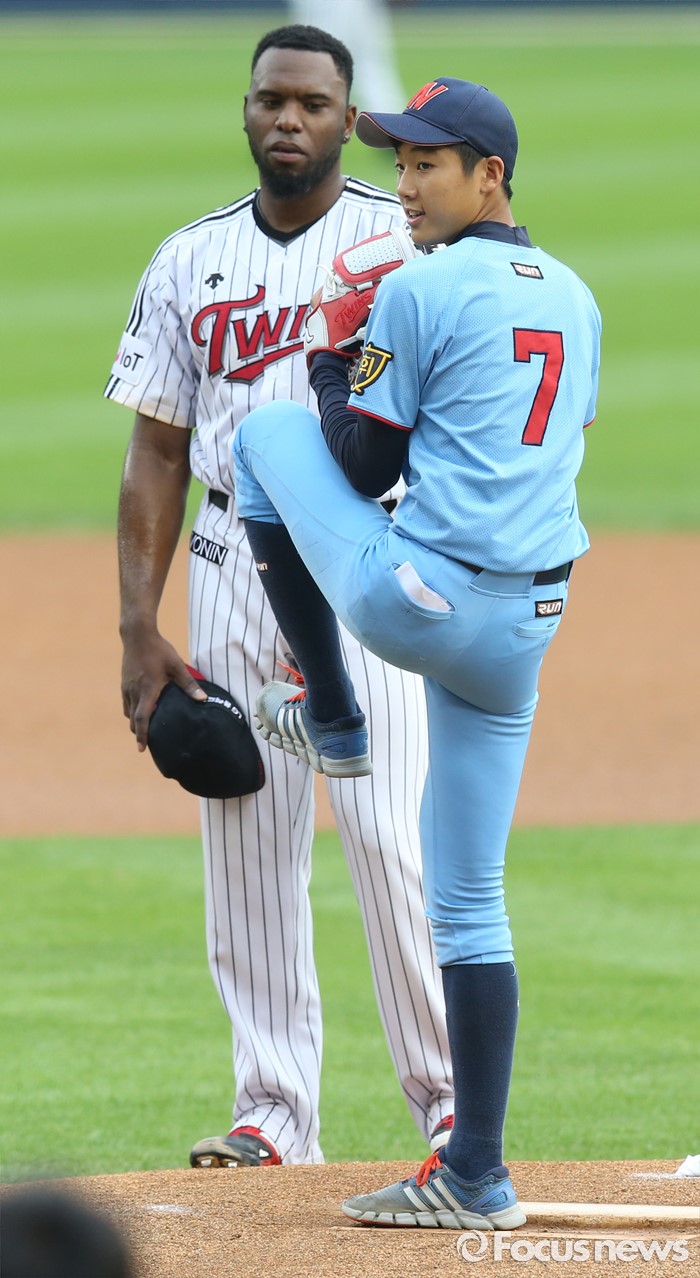 (서울=포커스뉴스) 13일 서울 잠실구장에서 열린 2016 프로야구 한화-LG 경기에서 LG 선발투수 소사가 시구하는 휘문중학교 문성준 선수의 투구를 지켜보고 있다.