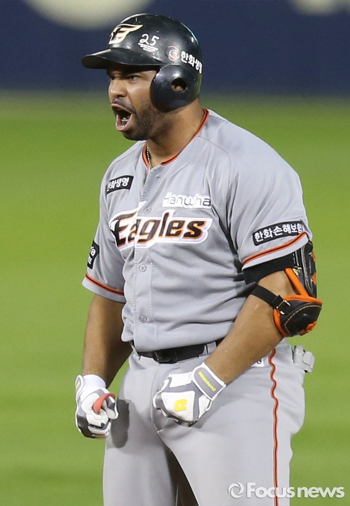 (서울=포커스뉴스) 13일 서울 잠실구장에서 열린 2016 프로야구 한화-LG 경기 8회초 2사 1,3루에서 한화 로사리오가 주자를 모두 불러 들이는 재역전 2루타를 치고 2루에서 포효하고 있다.