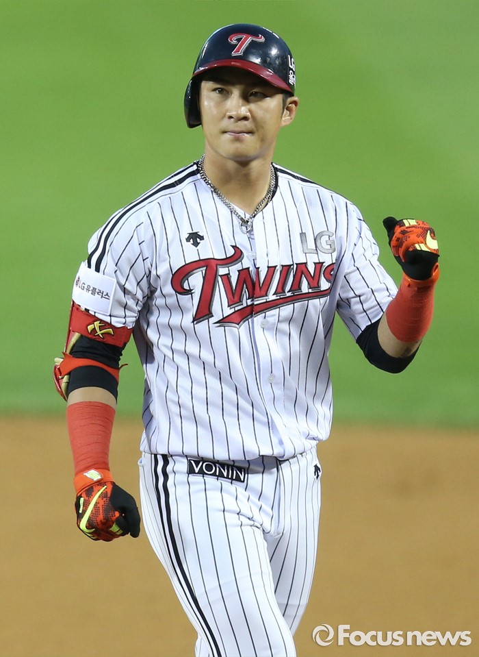 (서울=포커스뉴스) 13일 서울 잠실구장에서 열린 2016 프로야구 한화-LG 경기 4회말 1사 만루에서 LG 오지환이 2타점 우전 안타를 치고 1루에서 주먹을 불끈 쥐며 기뻐하고 있다.