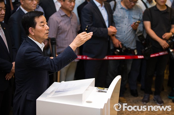 (서울=포커스뉴스) 13일 오후 한민구 국방부 장관이 경북 성주에 사드 배치를 확정한 국방부의 공식 발표 후 서울로 상경, 서울 용산 국방부 컨벤션센터를 항의 방문중인 김항곤 성주군 군수, 사회단체장 및 군민을 찾아 대화를 나누고 있다.