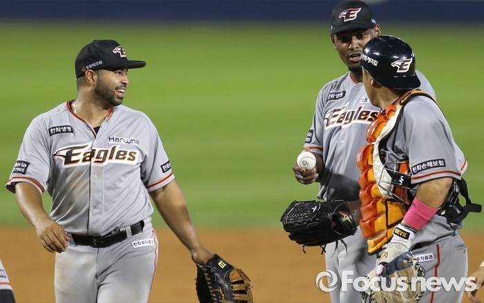 (서울=포커스뉴스) 13일 서울 잠실구장에서 열린 2016 프로야구 한화-LG 경기에서 LG에 재역전승한 후 한화 투수 카스티요와 포수 조인성이 밝은 ㅛ정으로 얘기하고 있다. 결승타를 친 로사리오가 활짝 웃고 있다.