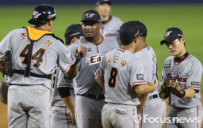 (서울=포커스뉴스) 13일 서울 잠실구장에서 열린 2016 프로야구 한화-LG 경기에서 LG에 재역전승을 한 한화 선수들이 마운드에 모여 승리의 기쁨을 나누고 있다.