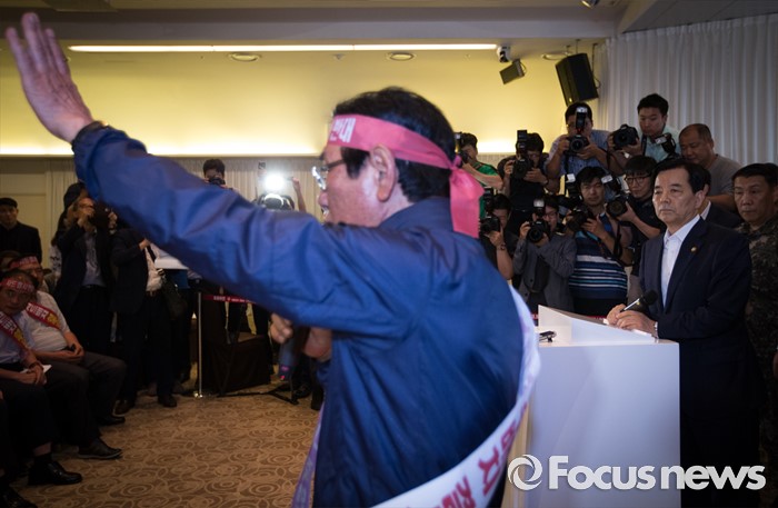 (서울=포커스뉴스) 한민구(오른쪽) 국방부 장관이 13일 오후 서울 용산구 국방컨벤션센터에서 사드 배치에 항의 방문 중인 김항곤 성주군수 등 사회단체장 및 군민들과 대화하고 있다. 국방부는 이날 경북 성주군을 고고도 미사일 방어(사드·THAAD)체계 배치 지역이라고 공식 발표했다.