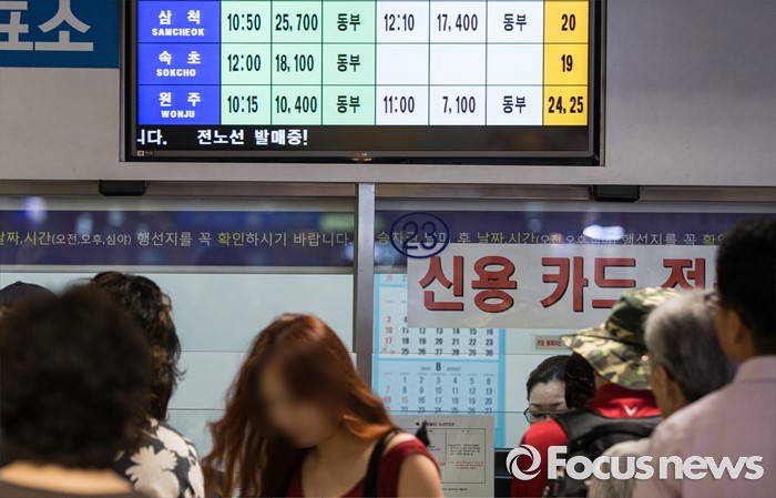 (서울=포커스뉴스) 14일 오전 서울 서초구 고속버스터미널을 찾은 승객들이 버스표를 구매하고 있다.