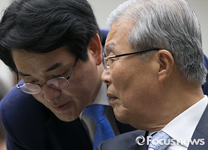 (서울=포커스뉴스) 14일 오전 서울 여의도 국회도서관에서 열린 민주적 여론형성을 위한 법제도 개선사항 정책토론회에 참석한 김종인(오른쪽) 더불어민주당 비대위 대표와 박용진 대표비서실장이 대화하고 있다.
