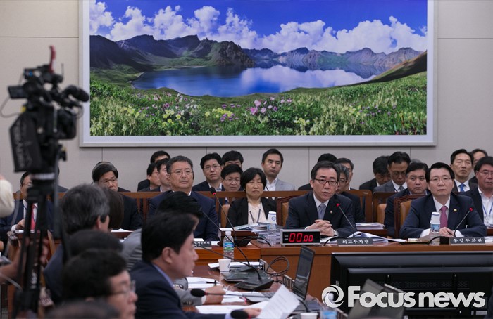 (서울=포커스뉴스) 14일 오전 서울 여의도 국회에서 열린 외교통일위원회 전체회의에 참석한 조태열(가운데) 외교부 2차관이 의원들의 질의에 답하고 있다. 오른쪽은 김형석 통일부 차관.