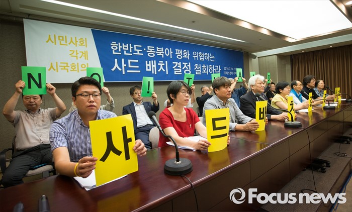 (서울=포커스뉴스) 시민사회 각계 인사들이 14일 오전 서울 중구 한국프레스센터에서 열린 한반도, 동북아 평화 위협하는 사드 배치 결정 철회 촉구 시국회의에서 손피켓을 들고 사드배치 결정 철회에 관련된 구호를 외치고 있다.