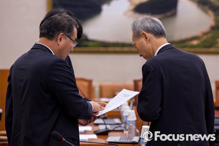 (서울=포커스뉴스) 국회 농림축산식품해양수산위원회 더불어민주당 간사 이개호(왼쪽) 의원과 이석태 세월호특별조사위원회 위원장이 14일 오전 서울 여의도 국회에서 열린 농림축산식품해양수산위원회 전체회의에 참석해 대화 하고 있다.