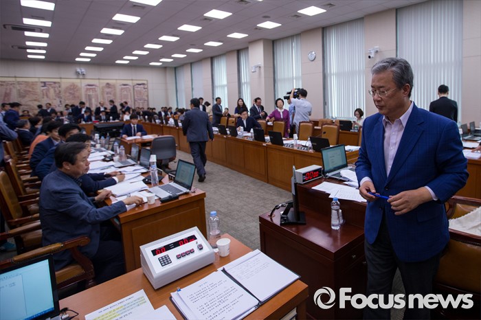 (서울=포커스뉴스) 국회 교육문화체육관광위원회 위원장인 유성엽 국민의당 의원이 14일 오전 서울 여의도 국회에서 열린 '교육문화체육관광위원회 전체회의'에 참석해 의사진행 발언에 문제를 제기한 이장우 새누리당 간사를 비롯한 다수 의원들에게 항의를 받고 정회한 뒤 회의실을 나서고 있다.