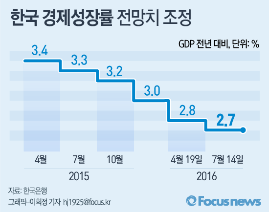 (서울=포커스뉴스) 14일 한국은행은 경제성장률 전망치를 지난 4월 전망치에서 0.1%p 하향된 2.7%로 보고 있다고 밝혔다.