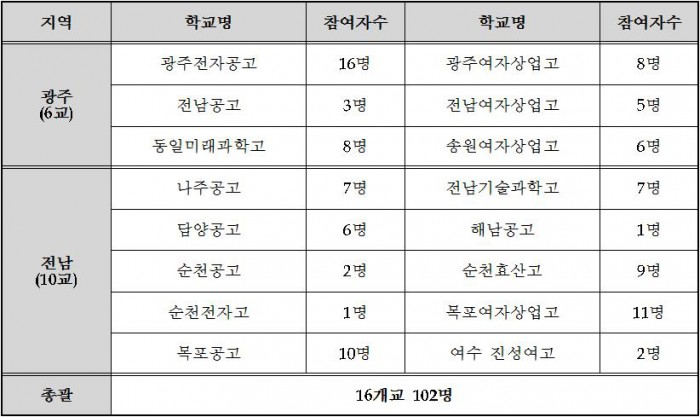 한편, 'ICT-3D프린팅 융합인력양성사업'은 올해 처음 시행하는 시범사업임에도 16개 특성화고 102명, 중소기업 40여개 업체가 참여하는 등 큰 호응을 얻고 있다.'ICT-3D프린팅 융합인력양성사업' 참여 현황.<자료제공=광주·전남지방중소기업청>