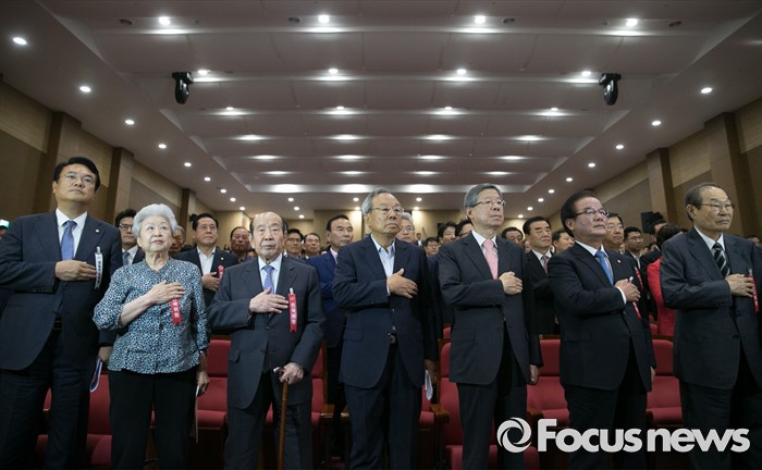 (서울=포커스뉴스) 14일 오전 서울 여의도 국회 의원회관에서 열린 새누리당 전국위원회에 참석한 지도부 및 상임고문단이 국기에 대한 경례를 하고 있다. 왼쪽부터 정진석 원내대표, 이연숙, 김수한 상임고문, 박관용 전 국회의장, 김희옥 혁신비대위원장, 정갑윤 전국위의장, 정재철 상임고문.