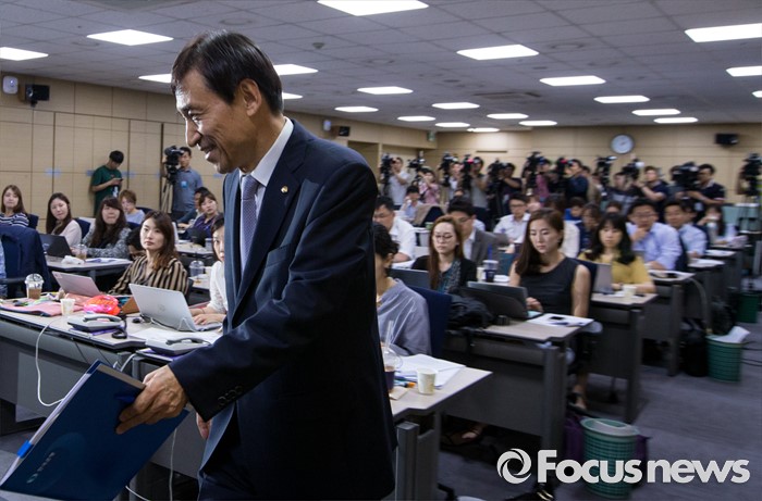 (서울=포커스뉴스) 이주열 한국은행 총재가 14일 오후 서울 중구 한국은행에서 최근의 물가안정목표제 운영상황에 대해 설명하기 위해 발걸음을 옮기고 있다.