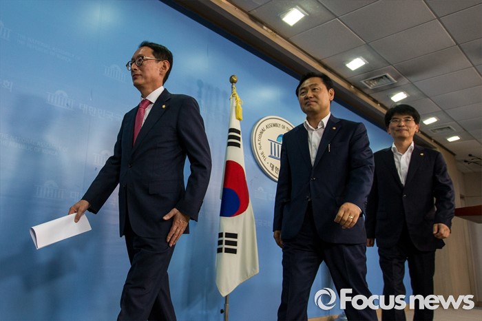 (서울=포커스뉴스) 여야3당 원내수석부대표가14일 오후 서울 여의도 국회에서 여야3당 원내수석부대표 합의사항을 발표한 뒤 기자회견장을 나서고 있다. 이날 여야3당은 사드(고고도미사일방어체계) 국내 배치 결정에 따른 논한과 관련해 다음주 긴급 현안 질의를 위한 국회 본회의를 개최하는데 합의 했다고 밝혔다. 왼쪽부터 김도읍 새누리당 원내수석부대표, 김관영 국민의당 원내수석부대표, 박완주 더불어민주당 원내수석부대표.