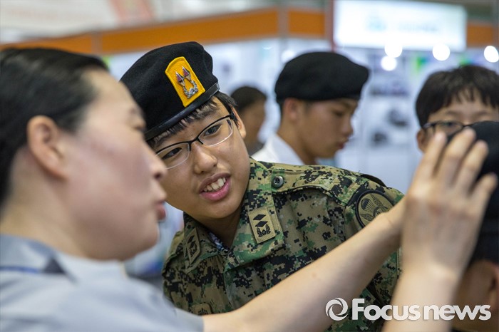 (서울=포커스뉴스) 14일 오후 서울 강남구 코엑스에서 열린 전문대학 엑스포에 참가한 학생들이 군복을 입는 체험을 하고 있다.