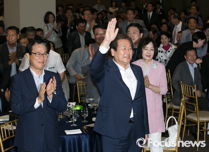 (서울=포커스뉴스) 14일 오후 서울 영등포구 그랜드컨벤션센터에서 열린 당대표 취임 2주년 행사에 참석한 김무성 새누리당 전 대표가 손을 들어 인사하고 있다.