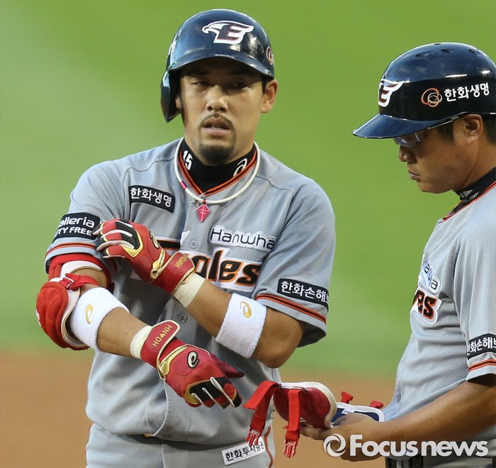 (서울=포커스뉴스) 14일 서울 잠실구장에서 열린 2016 프로야구 한화-LG 경기 2회초 2사 1,2루에서 한화 이용규가 우전안타를 치고 1루에서 팔꿈치 보호대를 풀며 사인을 보고 있다.