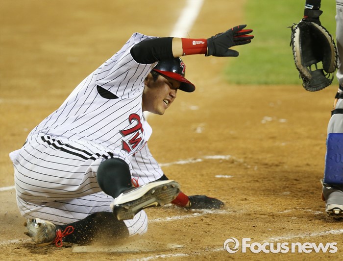 (서울=포커스뉴스) 14일 서울 잠실구장에서 열린 2016 프로야구 한화-LG 경기 5회말 무사 1,2루에서 LG 박용택의 우중간 안타때 2루주자 유강남이 홈인하고 있다.