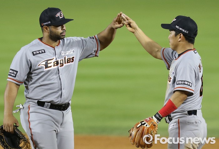 (서울=포커스뉴스) 14일 서울 잠실구장에서 열린 2016 프로야구 한화-LG 경기에서 LG에 승리하며 순위 바꿈을 해 7위로 올라선 한화 김정근우와 로사리오가 손가락 마주치기를 하고 있다.