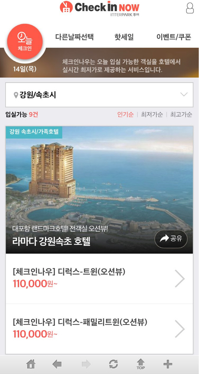 한편 인터파크투어의 국내숙박 예약앱 '체크인나우'를 통해 당일 투숙 가능한 호텔은 속초 더클래스300호텔(5만2570원부터), 속초 현대수리조트(5만1840원부터), 속초굿모닝가족호텔(4만5460원부터), 라마다 강원속초호텔(11만원부터) 등이 있다.국내 숙박 예약 앱 '체크인나우' 메인 화면.<사진제공=인터파크투어>