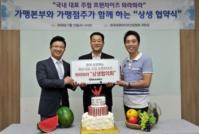 협회는 지난 13일 와라와라를 운영하고 있는 유대용 에프앤디파트너 대표가 연준서 점주협의회장 등과 만나 브랜드 경쟁력 강화 및 영업권 보장 등에 뜻을 모았다고 전했다. 이 자리엔 조동민 한국프랜차이즈산업협회장도 함께 자리했다.