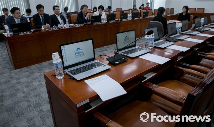 (서울=포커스뉴스) 15일 오전 서울 여의도 국회에서 예정된 가습기살균제 사고 진상규명과 피해구제 및 재발방지 대책 마련을 위한 국정조사특별위원회 전체회의에 참석한 야당 의원들이 새누리당 의원들을 기다리며 회의 진행을 하고 있다. 이날 새누리당은 더불어민주당 소속 홍영표 국회 환경노동위원장이 야당 단독으로 예비비 지출안 등을 처리한 것과 관련해 홍 위원장의 사퇴를 요구하며 모든 상임위 보이콧을 선언했다.