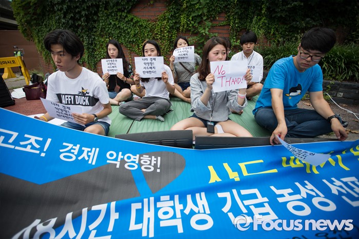 (서울=포커스뉴스) 좋은 대한민국 만들기 대학생 운동본부' 소속 학생들이 15일 오전 서울 용산 미군 기지 앞에서 '사드 배치 반대 48시간 대학생 긴급농성 선포' 기자회견을 마친 후 농성에 들어가고 있다.