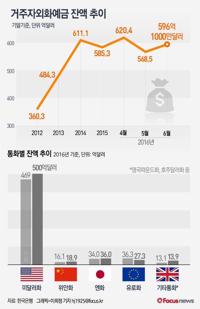 (서울=포커스뉴스) 한국은행이 15일 발표한 '2016년 6월중 거주자외화예금 동향'에 따르면 올 6월 말 기준 외국환은행의 거주자외화예금은 596억1000만달러로 지난달보다 27억6000만달러 늘었다.