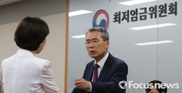(세종=포커스뉴스) 15일 저녁 세종시 정부세종청사 고용노동부에서 열린 최저임금위원회 제13차 전원회의에서 박준성 위원장이 공익위원들과 대화하고 있다.