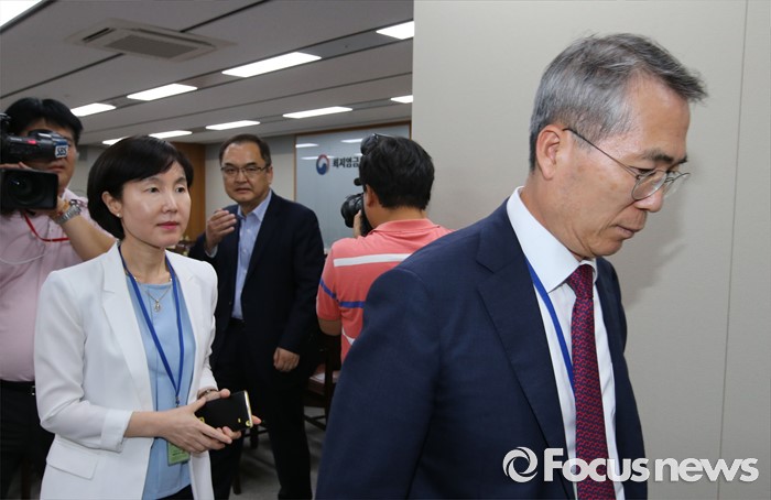 (세종=포커스뉴스) 15일 저녁 세종시 정부세종청사 고용노동부에서 열린 최저임금위원회 제13차 전원회의에서 박준성 위원장이 공익위원들과 회의장을 나서고 있다.