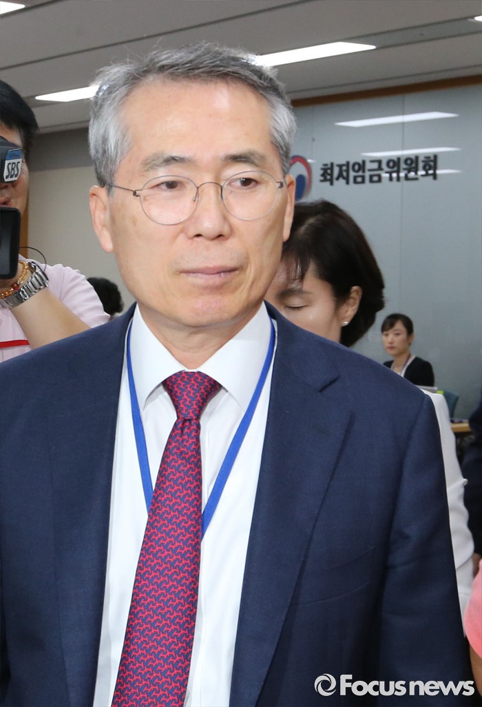 (세종=포커스뉴스) 15일 저녁 세종시 정부세종청사 고용노동부에서 열린 최저임금위원회 제13차 전원회의에서 박준성 위원장이 공익위원들과 회의장을 나서고 있다.