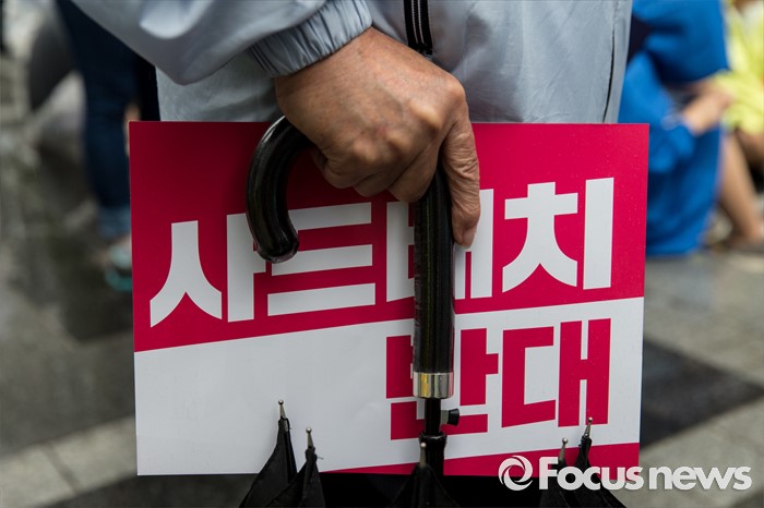 (서울=포커스뉴스) 16일 오후 서울 종로구 청계광장에서 사드한국배치반대전국대책회의 회원들이 사드 배치 결정 철회 평화행동을 하고 있다.