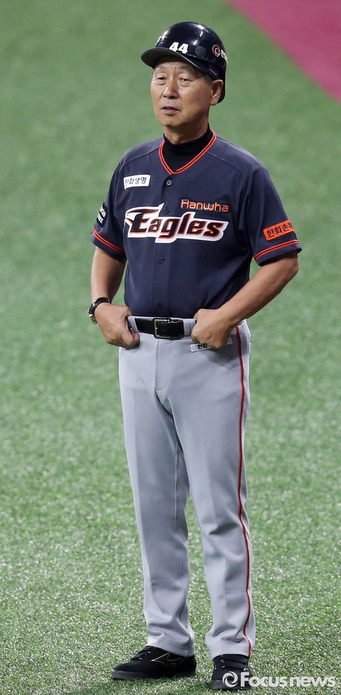 (서울=포커스뉴스) 16일 서울 고척 스카이돔에서 열린 2016 프로야구 올스타 경기에서 나눔팀의 1루코치로 한화 김성근 감독이 출장해 조인성의 헬멧을 거꾸로 쓰고 코치박스에 서 있다.