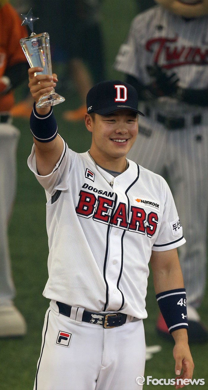 (서울=포커스뉴스) 16일 서울 고척 스카이돔에서 열린 2016 프로야구 올스타전에서 MVP로 선정된 드림팀의 민병헌이 트로피를 들어 보이고 있다.