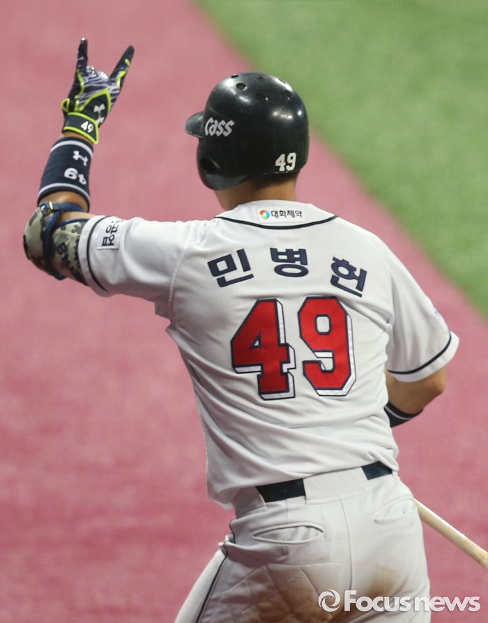(서울=포커스뉴스) 16일 서울 고척 스카이돔에서 열린 2016 프로야구 올스타 경기 7회말 1사후 드림팀 민병헌이 세 타자 연속 좌월 솔로 홈런을 치고 손가락 두개를 펴 보이며 더그아웃으로 뛰어가고 있다.