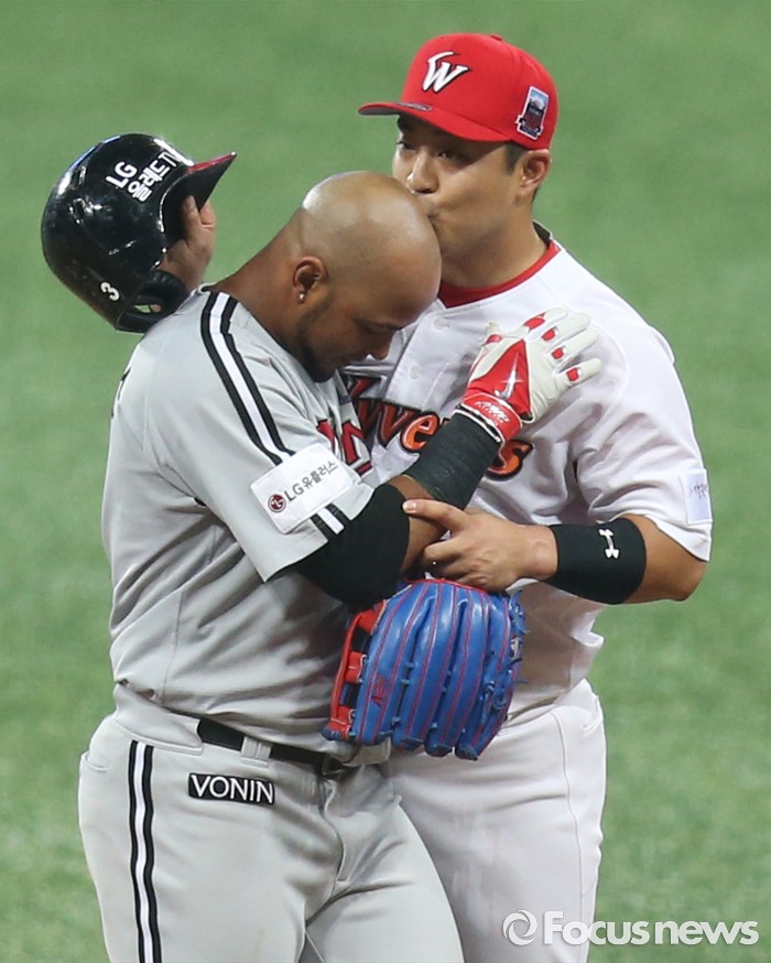 (서울=포커스뉴스) 16일 서울 고척 스카이돔에서 열린 2016 프로야구 올스타전에서 드림팀 정의윤이 나눔팀 히메네스의 헬멧을 벗기고 머리에 키스하고 있다.