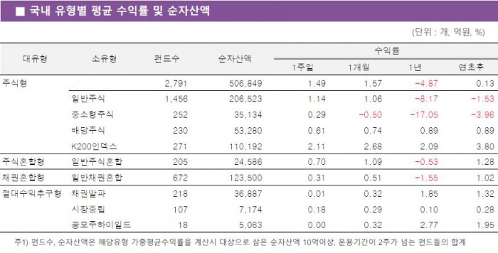 대형주 비중이 높은 K200인덱스펀드가 2.11%의 수익률로 국내 주식형펀드 중 가장 우수한 성과를 보였다. 일반주식펀드와 배당주식펀드도 각각 1.14%, 0.61% 상승했다. 대형주 강세장에서 중소형주식펀드는 0.29% 상승하는 데 그쳤다.